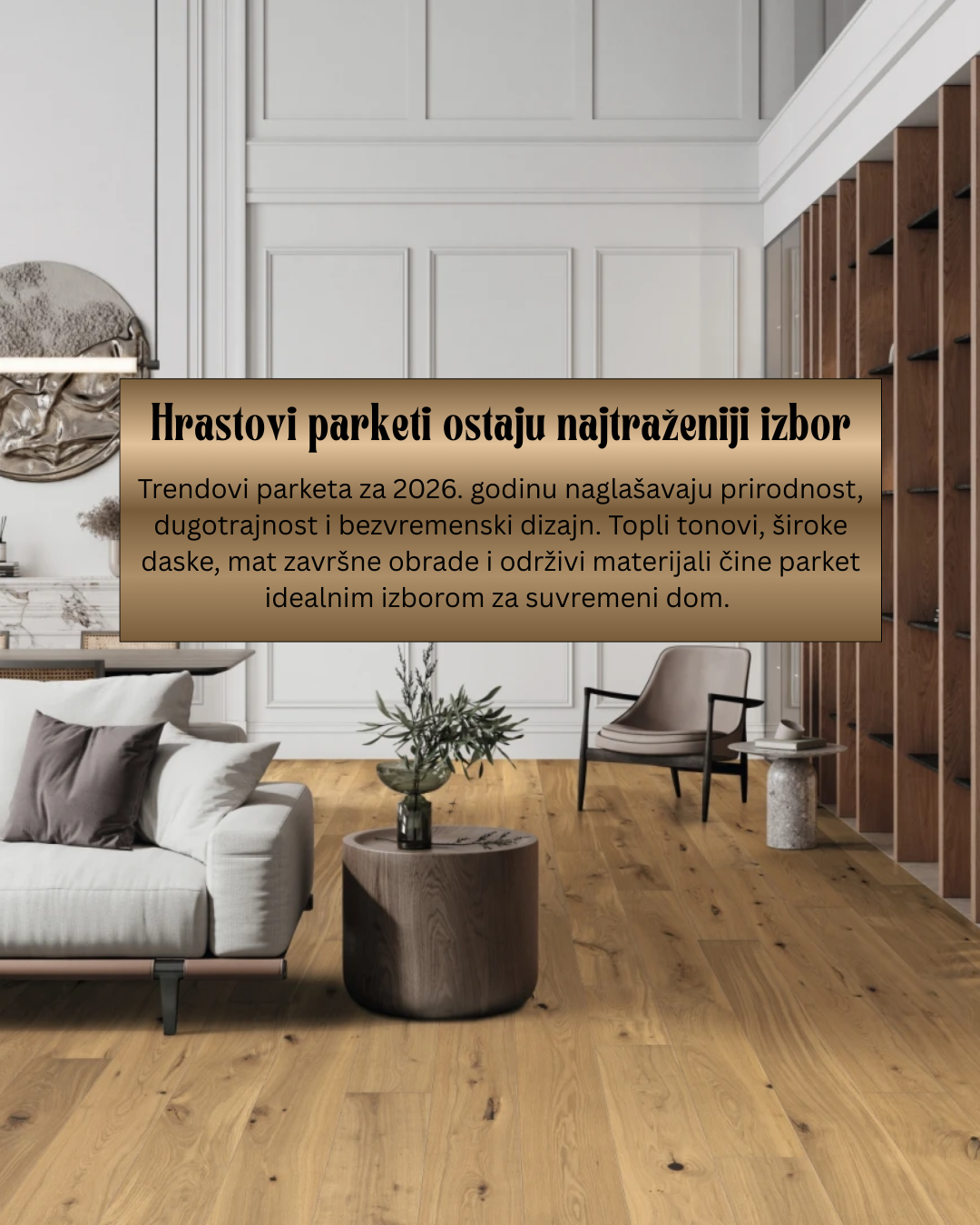 Hrastov parket i dalje je najtraženiji izbor podnih obloga zahvaljujući svojoj trajnosti, prirodnoj ljepoti i bezvremenskom izgledu. U trendu su topli, prirodni tonovi hrasta s mat završnom obradom koji prostoru daju eleganciju i toplinu. Zbog svoje stabilnosti, parket je idealan i za moderne interijere s podnim grijanjem.